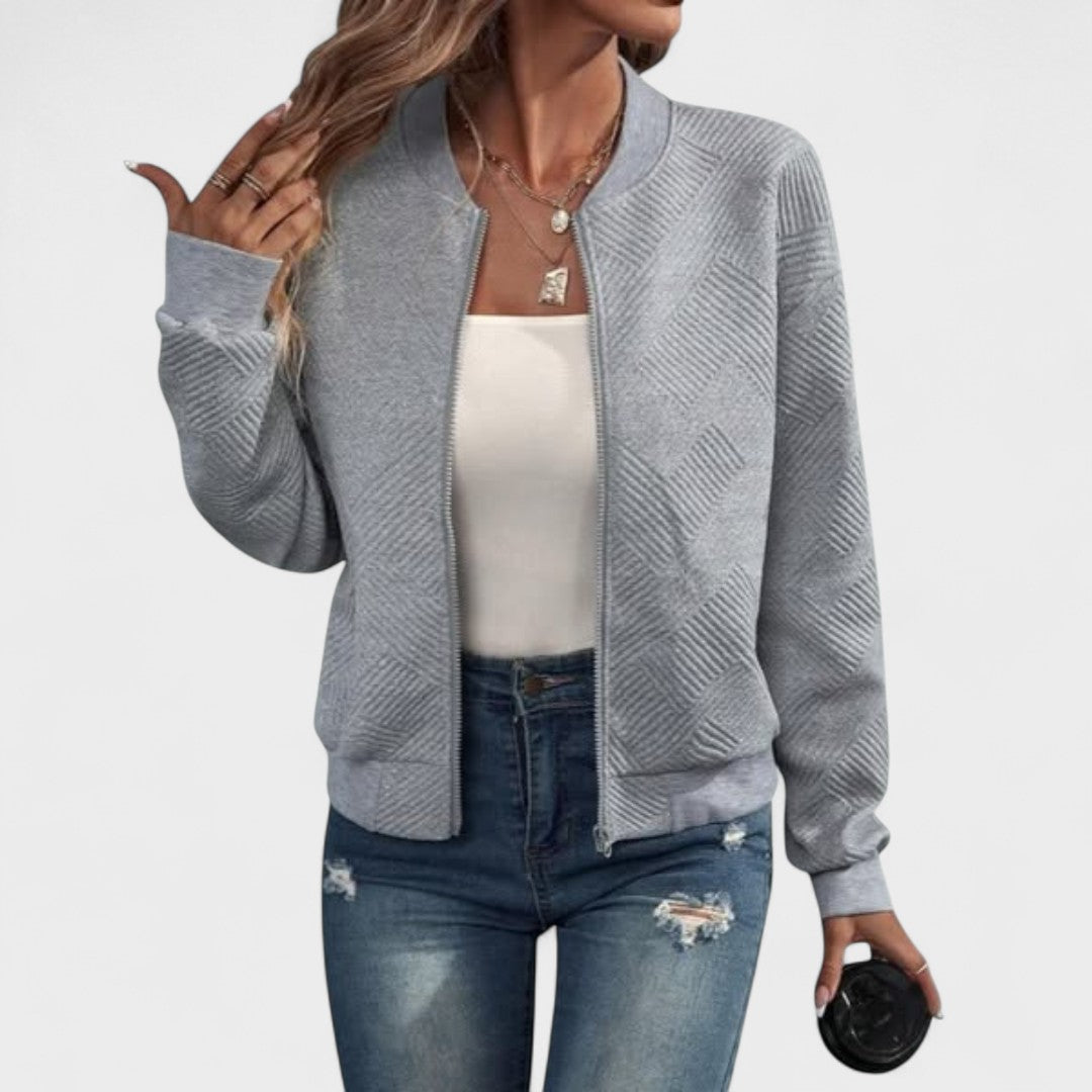 O casaco bomber Dora dá um toque contemporâneo a um clássico intemporal. Com padrão geométrico subtil, fecho prático e punhos canelados para um ajuste perfeito, é leve e ideal para conjugar com qualquer look – dos jeans aos vestidos – em qualquer estação do ano.