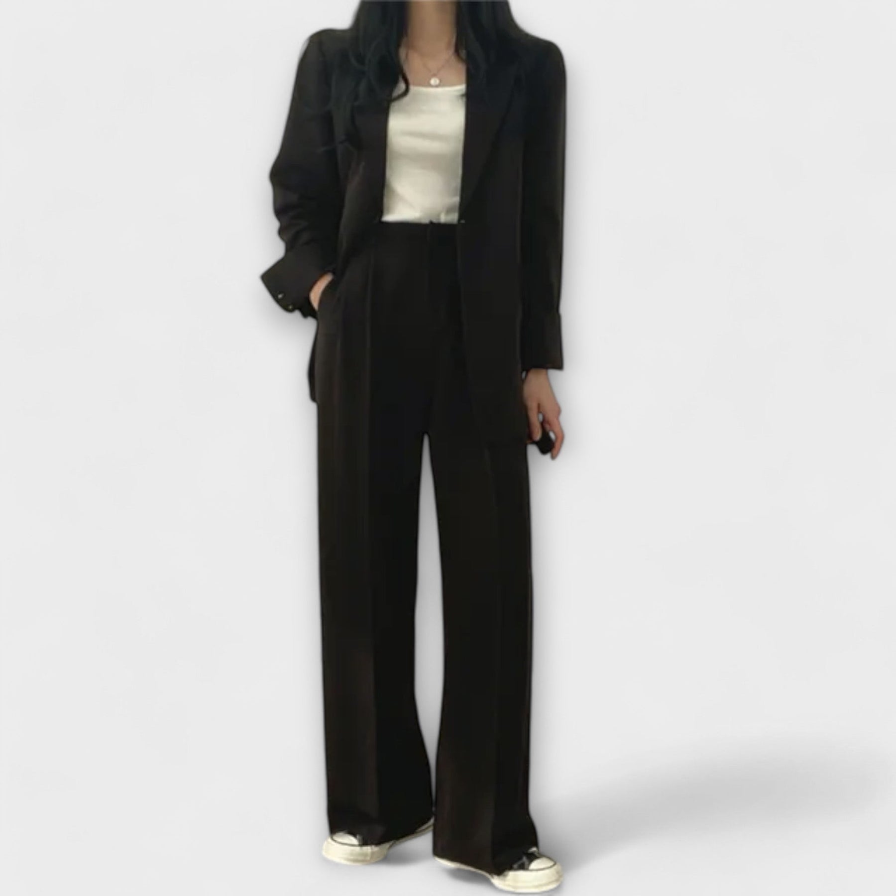 Este conjunto foi pensado para mulheres que procuram elegância, conforto e versatilidade numa só escolha. Composto por blazer e calças de corte fluido, combina o estilo clássico com um toque contemporâneo, criando um visual polido sem esforço.
