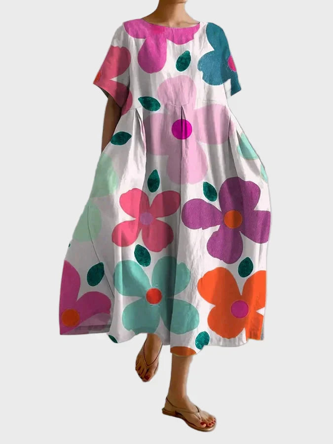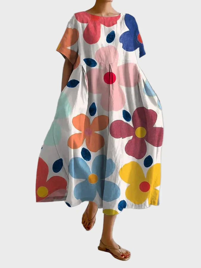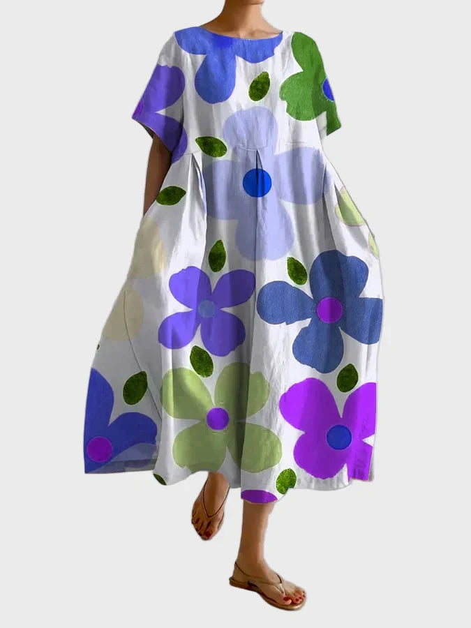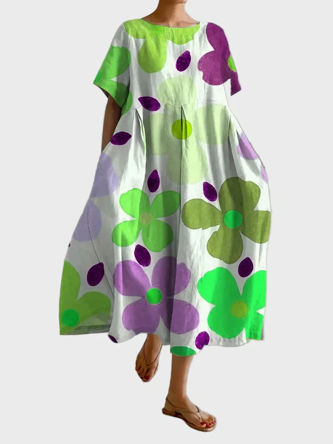 Traga cor e vivacidade para o seu verão com este vestido maxi estampado com flores oversized em tons de verde, lilás e roxo. O tecido leve e o corte solto tornam-no ideal para looks do dia a dia, passeios na praia e caminhadas descontraídas com estilo e conforto.