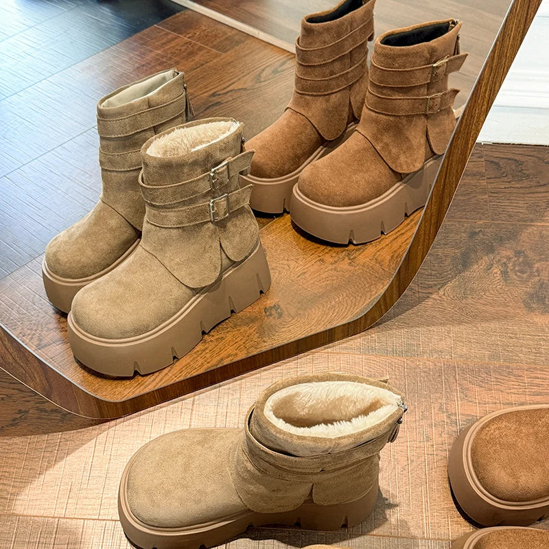 As Botas Valeria foram criadas para mulheres que valorizam tanto o estilo quanto o conforto. O interior forrado em algodão macio proporciona uma sensação de calor aconchegante, enquanto o design com cinto e fivela confere um toque sofisticado e atual. A sola grossa e antiderrapante garante estabilidade e confiança, tornando estas botas perfeitas para enfrentar o frio com elegância.